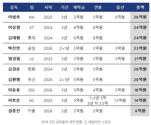 현재 KBO 리그 감독 중 최고 대우를 받고 있는 이는 **KIA 이범호 감독(3년 총액 26억 원, 옵션 6억 원)**이며,